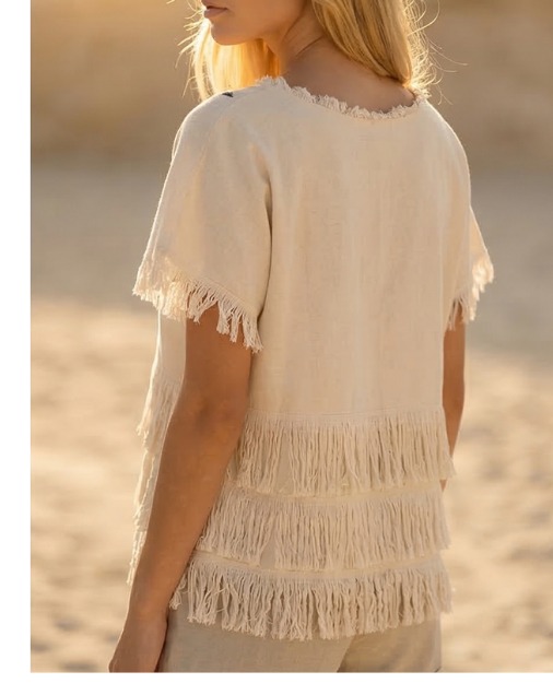 NAIRA EMBROIDERED FRINGE TOP — Organic Bamboo Blend — Natural Beige / Black Embroidery